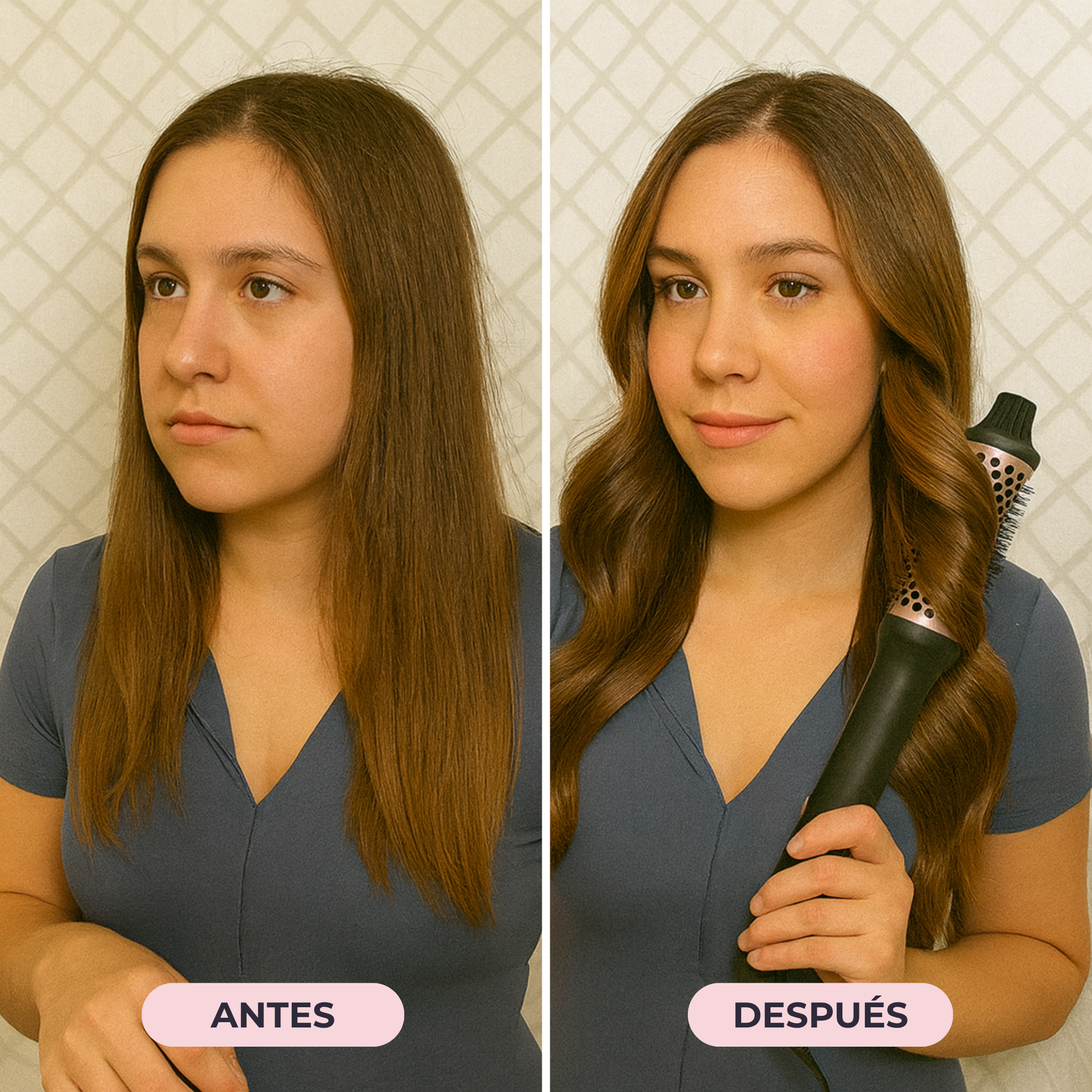 Para un look liso y pulido, pasa el cepillo directamente hacia abajo. Si prefieres ondas o rizos con movimiento, enrolla las puntas y suelta con suavidad para un acabado impecable digno de salón. ✨