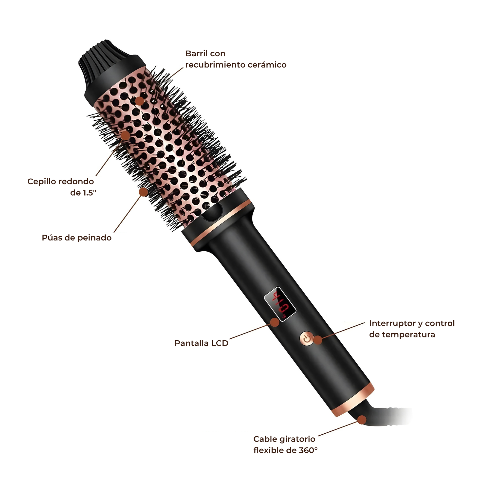 El Cepillo 3 en 1 combina rizador, plancha y cepillo en una sola herramienta versátil. Su barril con recubrimiento cerámico y cerdas de 8 mm antienredos dejan el cabello suave y sin frizz, con ajustes de temperatura entre 120 °C y 210 °C. Se calienta en solo 30 s y cuenta con pantalla LCD. El cable giratorio de 360° evita enredos, y su diseño ergonómico garantiza comodidad en cada uso.